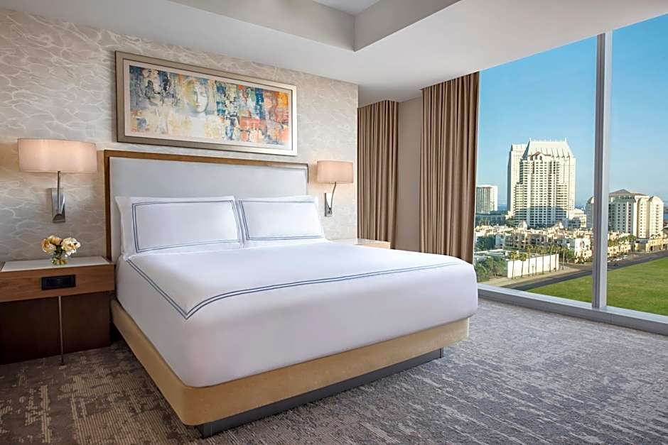 Located on a high floor, this guestroom has floor-to-ceiling windows with water views. It features a desk, walk-in shower and a Keurig® coffeemaker. A 49-inch TV, robe and slippers and a mini bar are provided, as are a safety deposit box and chaise.